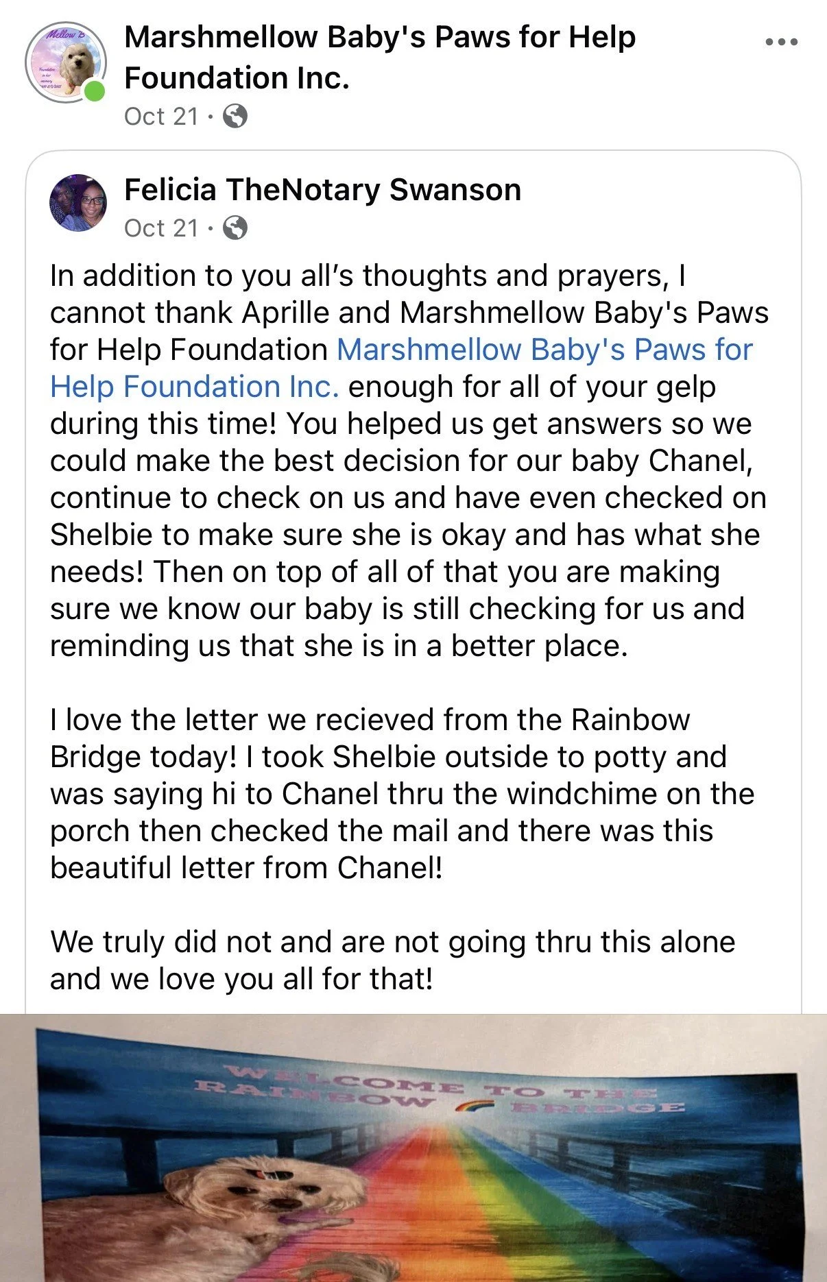 We are so touched by the kind words and stories shared by families who furbabies we’ve helped. Every message reminds us why we do what we do- spreading love, hope and pawsitivity in honor of Furangel Mellow B’s heartfelt legacy.